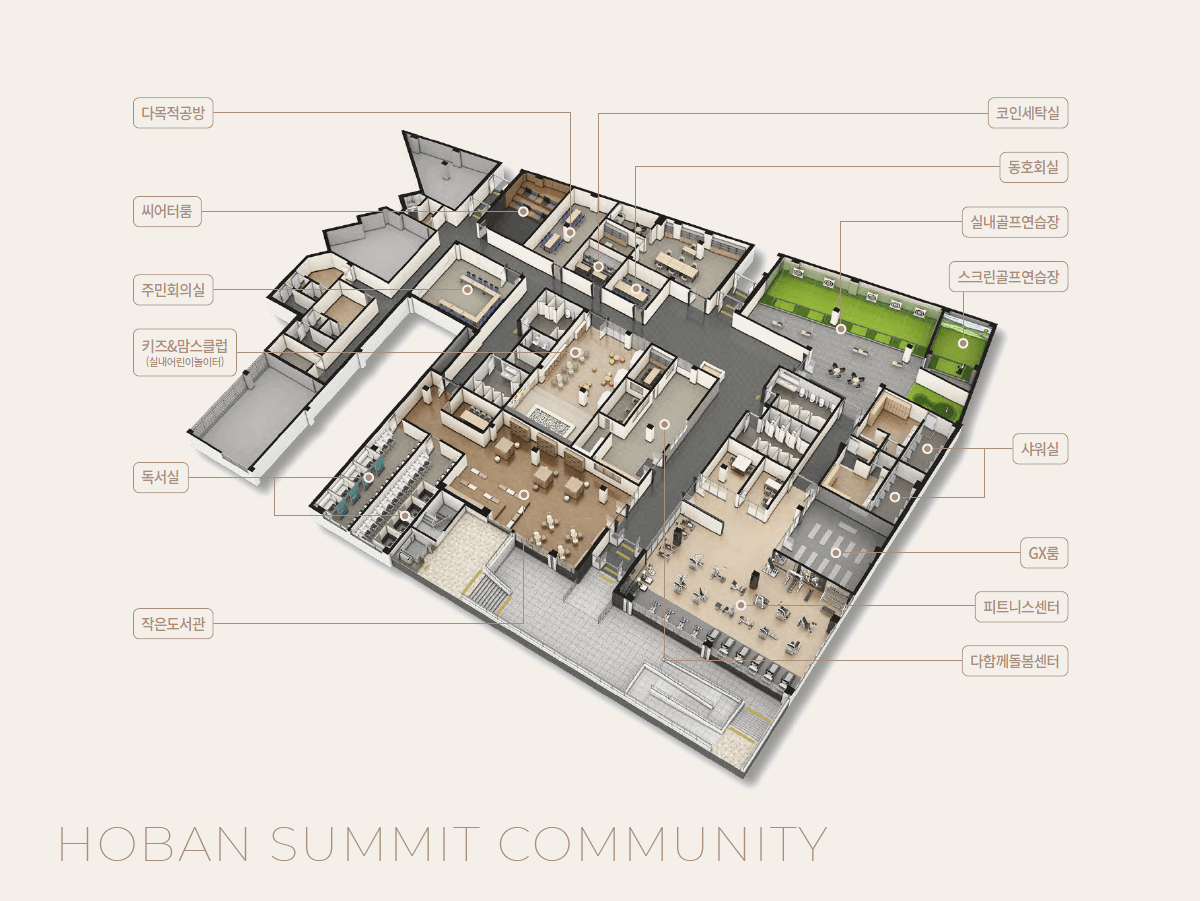 작은도서관, 실내골프연습장, 독서실, 시어터룸, 피트니스센터/GX룸 등으로 주민들이 즐길 수 있는 커뮤니티 시설이 완비되어 있습니다.